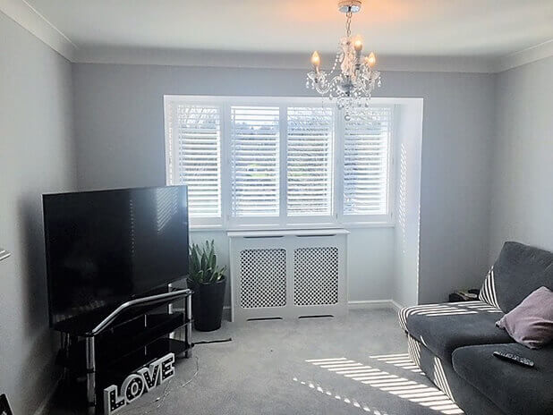 We installed the shutters using plain stiles, 4 sided deep plane L frames and finished them all in a pure white with stainless steel hinges. Candice was thoroughly impressed with the end result and we thing they really improve the bay window area, especially combined with her existing wooden radiator cover!